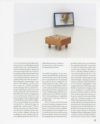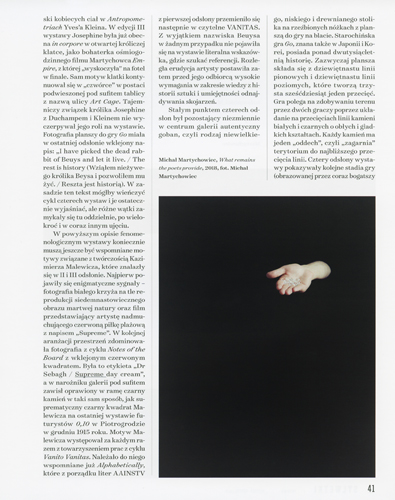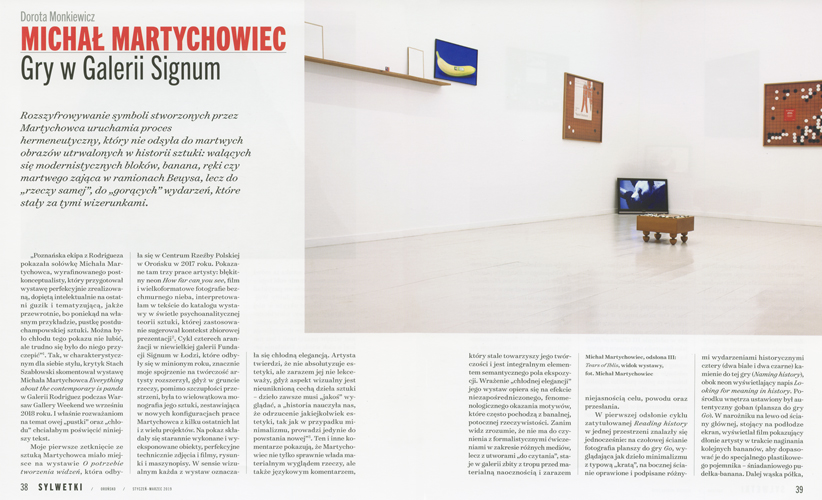 “The Poznań-based Rodriguez team presented a solo by Michal Martychowiec, a sophisticated post-conceptualist, who developed a perfectly crafted exhibition, intellectually impeccable, which perversely, because in a way on its own example, addresses the emptiness of post-Duchamp art. While the coldness of the show could not be to everyone’s liking, there was hardly anything one could criticize.”