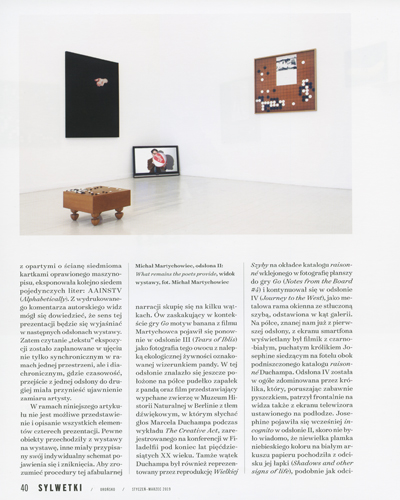 The artist’s work on the format of the exhibition can be considered as a postmodern game of solving riddles. However, there are enough indications to treat it as a tool for creating a text that requires a hermeneutical reading, and I understand the term “hermeneutical” in the strict, Gadamer’s sense of the term. In every installment Martychowiec showed the viewers a GO board. “The “game” is also one of the central terms of hermeneutical epistemology, describing the way in which a rational individual resides in the world and finds his or her identity in it. This is due to the understanding of one’s place in history as a result of the interpretation of cultural texts. Among them, art plays an important role as the work of the mind that self-defines itself in and through history. Gadamer understands the work of interpretation as a game whose subject is not the player (interpreter), but the game itself. As the philosopher claimed, the aim of the game is simply to play (i.e. life, existence in history). Martin Heidegger had a similar view of a work of art whose subject is not the artist but the art itself, and the artist is only the way in which a work of art exists. These ideas resound in Martychowiec’s statements when he says that “The work of creation is meant to be forgotten, so that the introduced symbols, free from original constraints can acquire broader cultural significance.” .