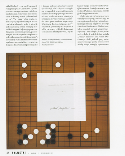 The fixed point of the four installments was the authentic goban – a kind of small, low, wooden table on curved legs with a game board on the top – which remained in the center of the gallery. The old Chinese game Go, also known in Japan and Korea, is more than two thousand years old. Usually the board consists of 19 vertical lines and 19 horizontal lines, which form 361 intersections. The game involves two players conquering the terrain by arranging smooth, rounded black and white stones at intersections. Each stone has one “breath”, i.e. it “seizes” the territory up to the nearest intersection of the line. Four editions of the exhibition showed the successive stages of the game (depicted by an increasingly complex system of white and black stones), played in 1846 in Japan by a renowned master with a seventeen-year-old young man, in which the youngster defeated the master. This game became for the artist a symbolic image of the dying of tradition, defeated by the energy of the inevitable historical process. The physical presence of the goban, just like the photographed board of a grid of “minimalism”, provided a framework for Martychowiec’s historiosophical reflections. Their subject is the passing and death of successive historical civilizations, for which a special case is the formation of Western European modernism, confronted with the tradition of the premodern West and the postmodern East. The latter was addressed, among others, by Martychowiec’s forged Chinese identity document presented at the exhibition, resulting from his personal observations on how artists from the Middle Kingdom function on the global art world stage.