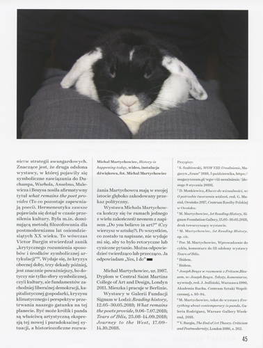 Deciphering of symbols created by Martychowiec triggers a hermeneutical process, which does not refer to the dead images recorded in the history of art: collapsing modernist blocks, a banana, a hand or a dead hare in Beuys’ arms, but to the “thing itself”, to the “hot” events that were behind those images. Through the work of an interpreter, their ideas, senses and values can come to life anew and be included in the circle of our vague modernity. Martychowiec’s personal attitude to modernism is neither cold nor critical. On his website we read that “despite modernity’s many attempts to change the world, contemporary art ends up over and over being repetition of a repertoire of the same ideas which eventually have become empty” , which, as I understand it, refers to superficial imitation of the avant-garde strategies. It is significant that the second part of the exhibition, in which symbolic references to Duchamp, Warhol, Anselmo, Malevich and Beuys appeared, was affirmatively entitled What remains the poets provides. Hermeneutics has always emerged during the cultural crisis. It was, among other things, the dominant philosophical method for postmodernism of the 1980s. It seems that the crisis of the present day, three decades later, is much more serious, because it concerns not only the symbolic sphere, i.e. culture, but also the foundations of Western liberal democracy, capitalist economy, climate crisis and the prospects for survival of our species on this planet. Perhaps the rabbit and the panda are a proper artistic expression of this new and paradoxical situation, and Martychowiec’s historiosophical reflections have a profoundly encoded political message in their essence.