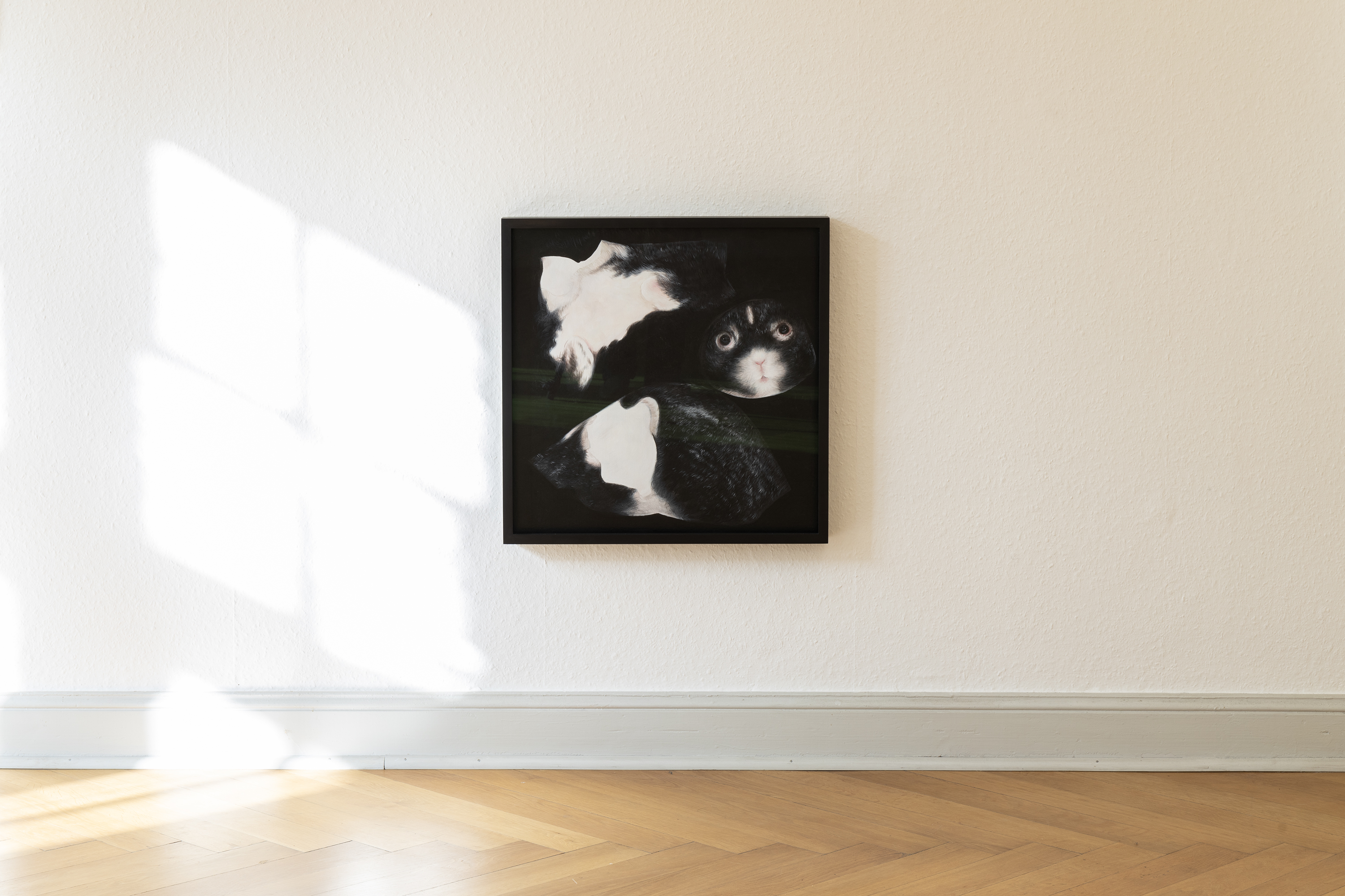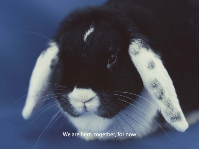 The photographic work Still from ‘Pixelated Venus’ (2017) functions as a key component within this overarching project. Depicting the living rabbit Josephine, it is subtitled with the phrase, ‘We are here, together, for now’. This text directly explores this core thesis, meditating on the multiple finite frames at play: the artwork’s own lifespan, the spectator’s lifespan, and the limited duration of their shared encounter before this living ‘act’ transitions into history.